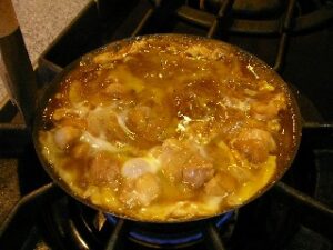 - 鶏肉の色がかわったら、玉ねぎを入れ炒め、作ったタレを加えます。